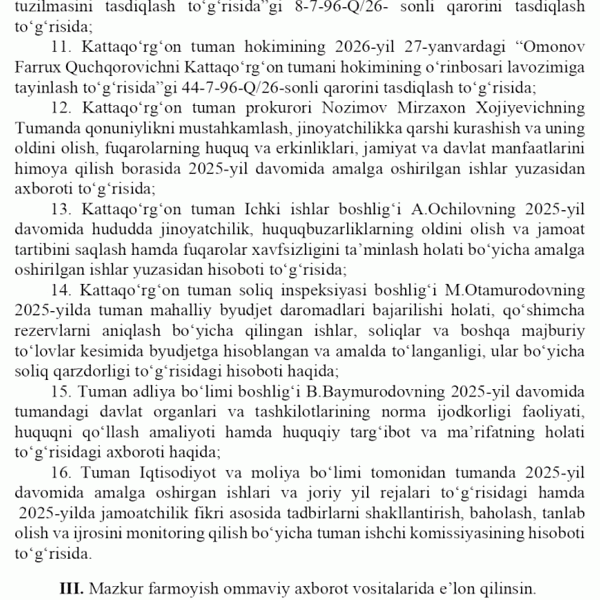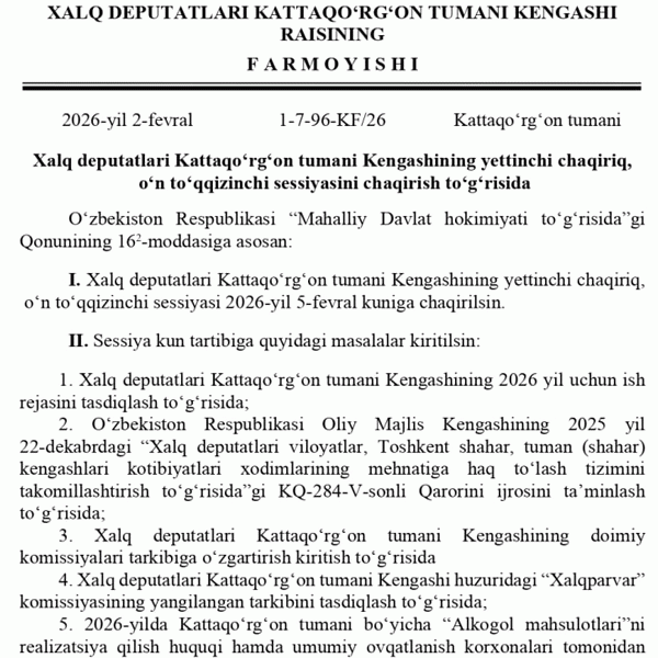 Navbatdagi sessiya chaqirilmoqda: unda qanday masalalar ko‘riladi? Siyosat / Jamiyat 02-фев, 15:20 38 0 Хато топдингизми? Сичқонча ёрдамида хато қисмини танланг ва CTRL+ENTER тугмачаларини босинг. Кўрсатилган ойнада муаммони тавсифланг ва маъмуриятга хабарнома юборинг. Бошқа хабарлар Siyosat / Jamiyat Navbatdagi sessiya chaqirilmoqda: unda qanday masalalar .. Navbatdagi sessiya chaqirilmoqda: unda qanday masalalar ko‘riladi?... Siyosat / Jamiyat XALQ DEPUTATLARI KATTAQO‘RG‘ON TUMANI KENGASHINING QARORI .. XALQ DEPUTATLARI KATTAQO‘RG‘ON TUMANI KENGASHINING Q A R O R I 2026-yilda Kattaqo‘rg‘on... Изоҳ қолдириш